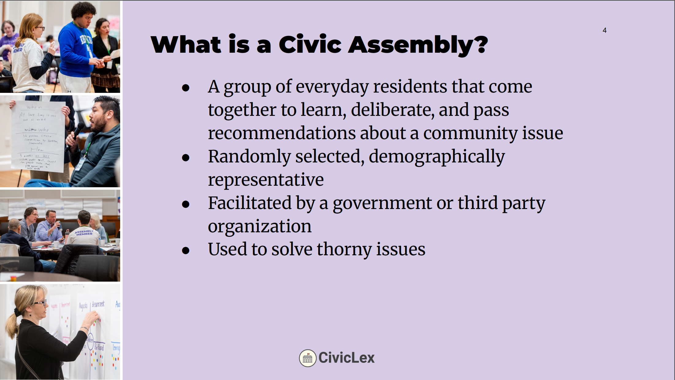 The April 28th General Government and Planning Committee meeting will be Councilmembers' first opportunity to do so. They may have questions or thoughts about the process and the recommendations the Civic Assembly developed.