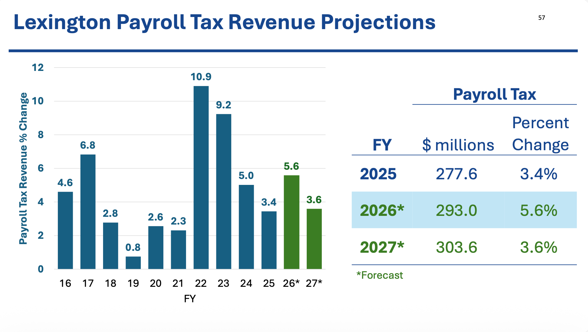 Lexington's payroll growth is expected to grow at a slower rate over the coming years, likely impacting the city's ability to create new positions and recurring programs.