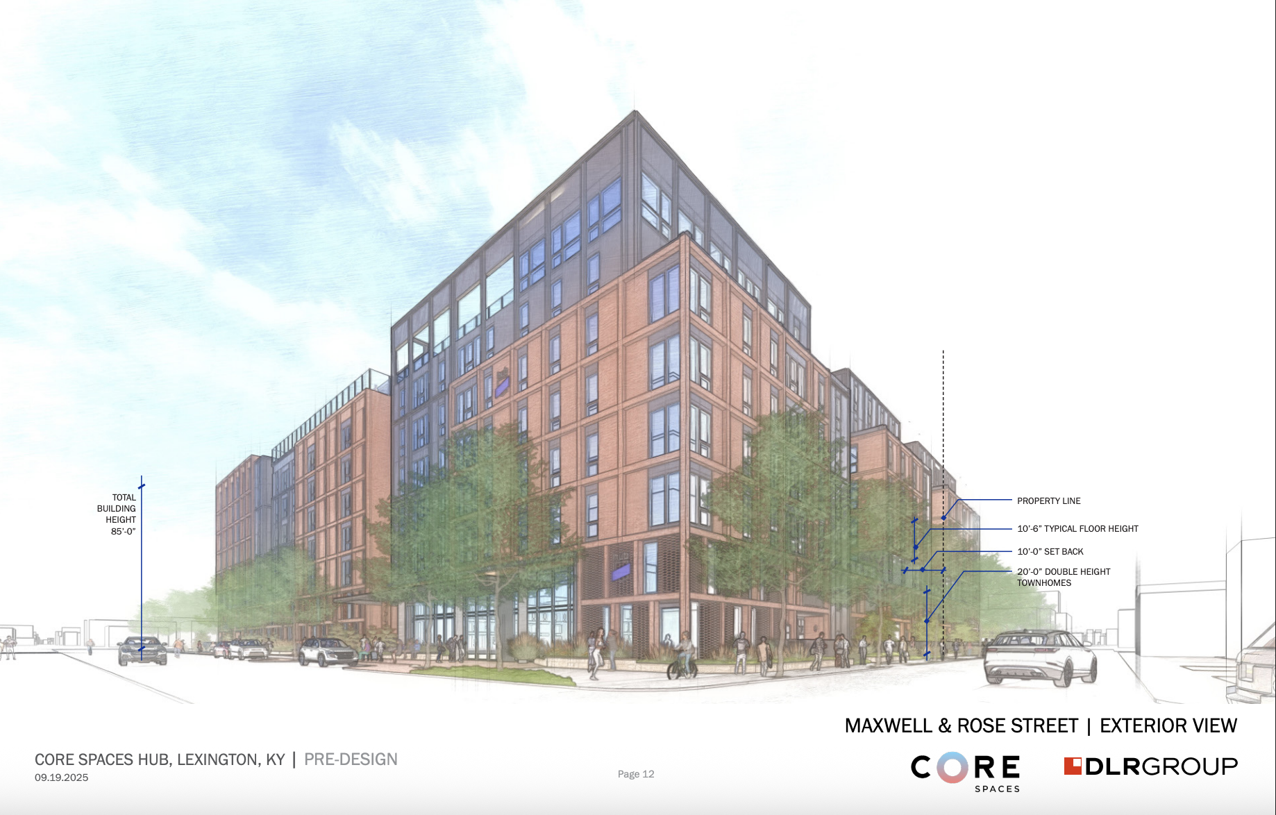 The apartment complex, proposed by Core Spaces – which owns both of The Hub apartment complexes near UK's campus – would be eight stories and have 322 units. Core Spaces is seeking to have the properties rezoned to the Downtown Business Zone (B-2). The properties on that block are all currently zoned as Medium Density Residential (R-4).