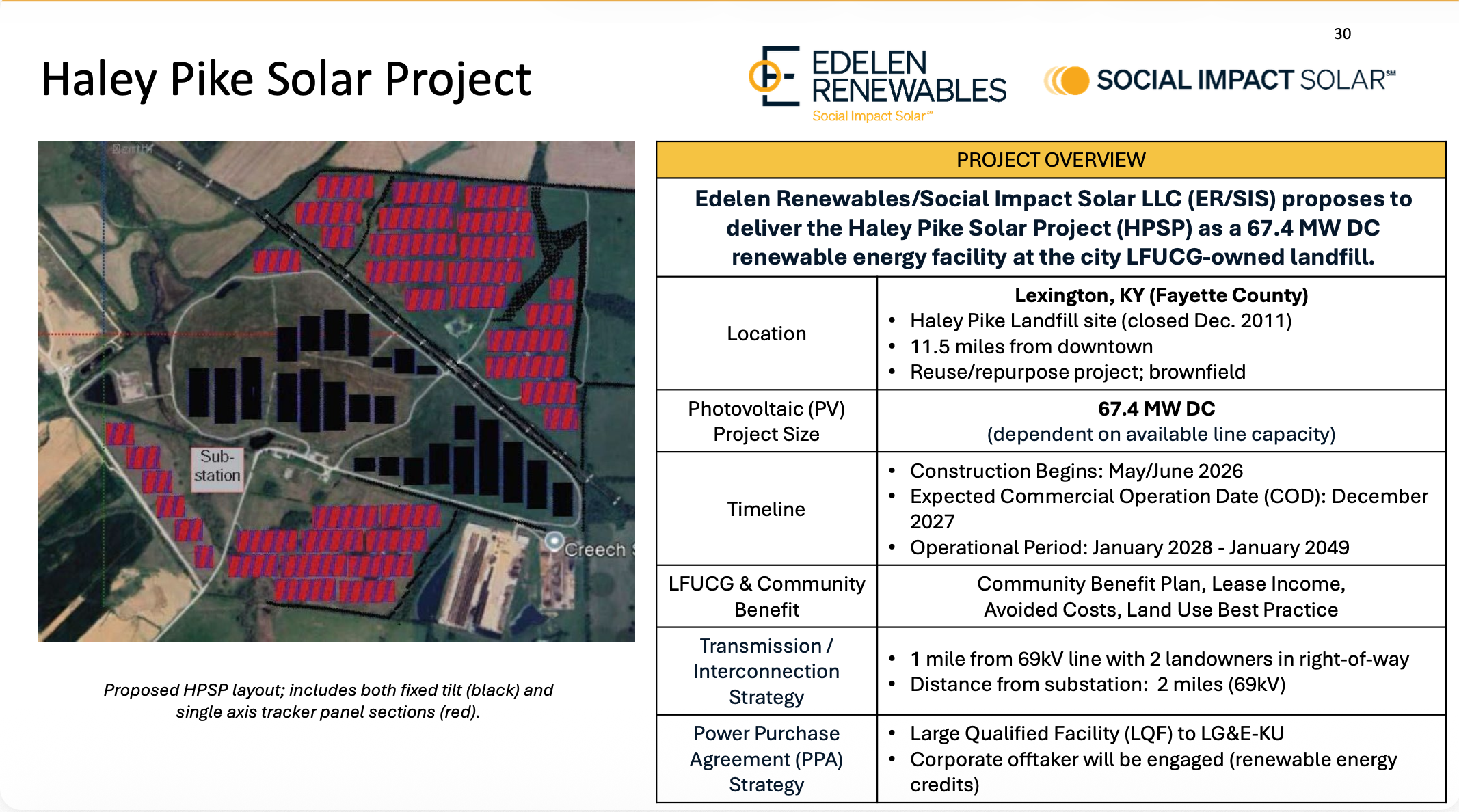 Edelen Renewables has also proposed a Community Benefit Plan that would include workforce training programs, educational partnerships with Fayette County Public Schools, and collaboration with city sustainability staff.