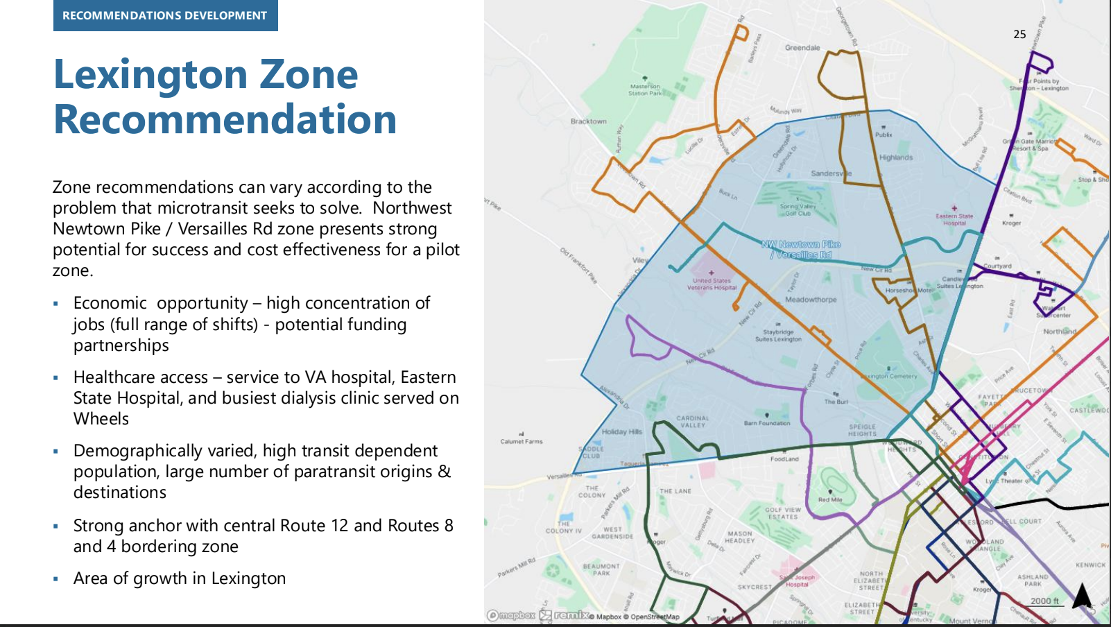 If riders want to go to a destination outside the zone, they would have to take a microtransit trip to a bus stop and connect to Lextran's bus routes for the rest of the trip.