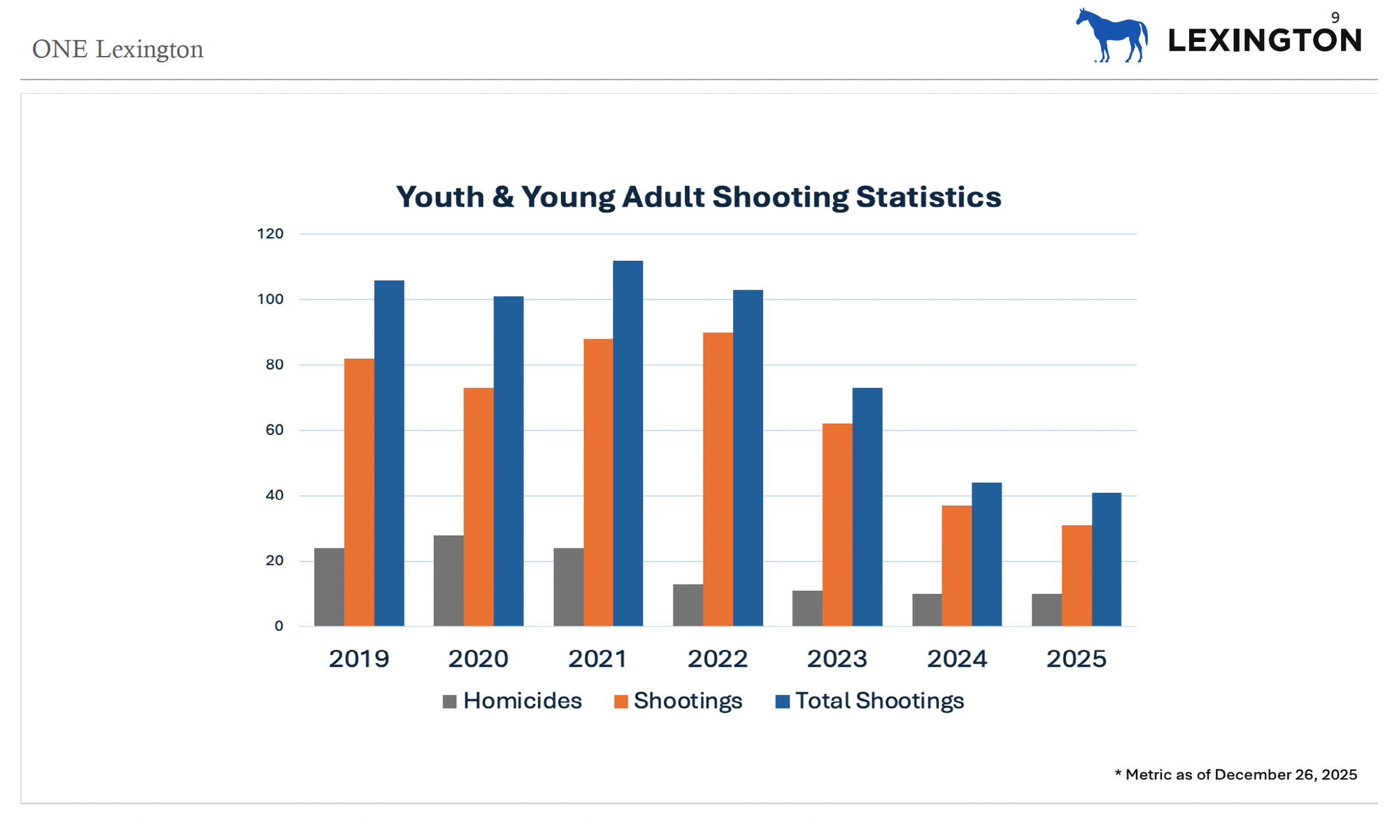 Total shootings and homicides in the aggregate have fallen from peaks in 2020 and 2021, and statistics have improved in the following ways, according to ONE Lexington's presentation materials: