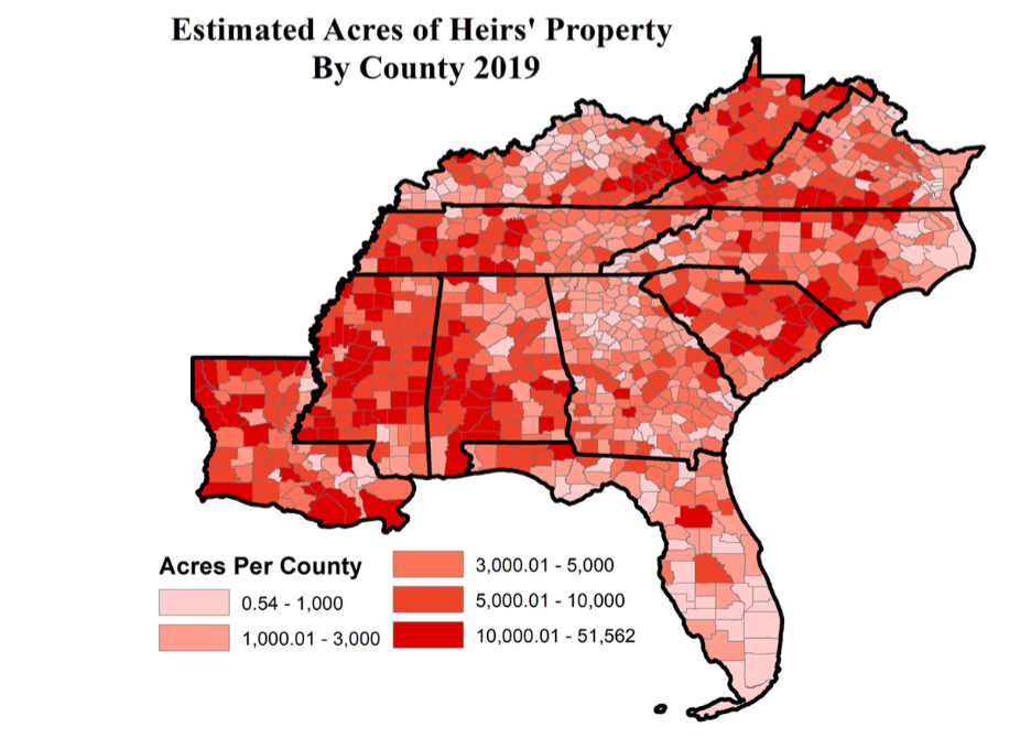 Estimated acres of heirs’ property by county. Seen in “Identifying Heirs’ Property: Extent and Value Across the South and Appalachia." Journal of Rural Social Sciences