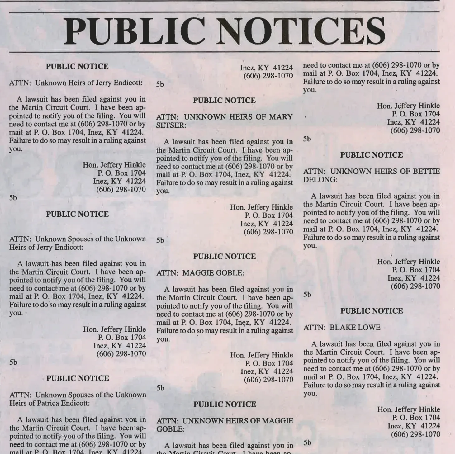 “Public notices section of the January 31, 2024 publication of the Mountain Citizen, a newspaper in Martin County, where Warning Order Attorney Jeffrey Hinkle posted more than a dozen foreclosure notices to unknown heirs' property owners.” Courtesy Kevin Slovinsky